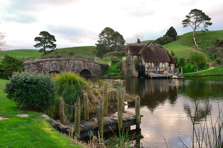 MATAMATA, NEW ZEALAND - AUGUST 2017: Bridge and water mill in Hobbiton movie set featured in Lord of the Rings and Hobbit movies on August 27, 2017 in Matamata