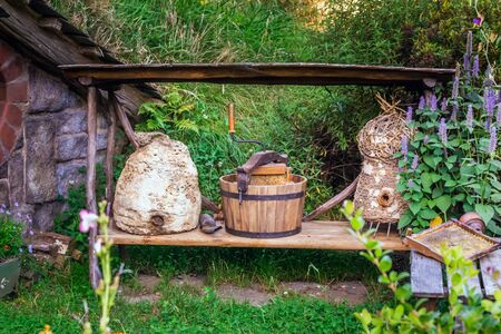 Beautiful garden with flowers and nice hut.