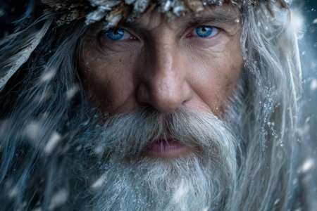 An enigmatic figure stands resolutely, adorned with ice and snow, his piercing blue eyes captivating in the cold.