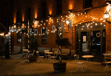 Helsinki, Finland - February 18, 2019: Holiday Bar exterior at night, illuminated with christmas lights and located near Uspenski Cathedral