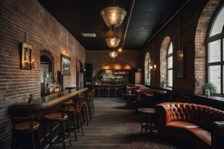Dimly lit pub interior evokes warmth, with its bar counter and wooden chairs. Generative AI