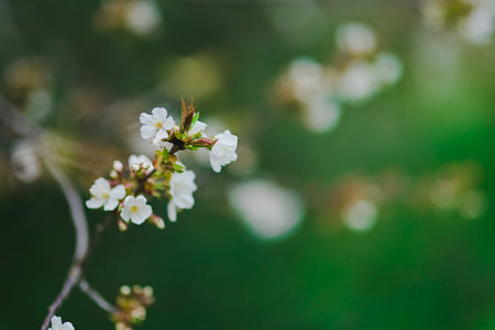 Detail of beautiful branch of white cherry tree flowers with smooth green background during spring season in the park