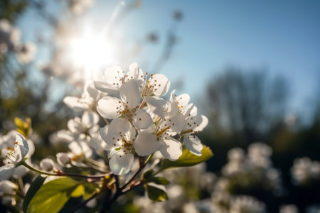 Spring blooming - white blossoms and sunlight in the sky, Generative ai