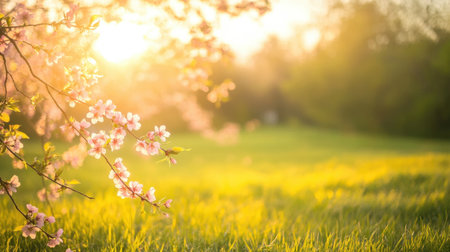 A beautiful spring landscape showcasing cherry blossoms with soft sunlight filtering through, illuminating a lush green meadow in a peaceful morning setting.