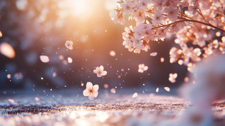 A tranquil spring pathway adorned with delicate cherry blossom petals drifting in the breeze, bathed in soft golden hour light, capturing nature's beauty.