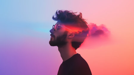 portrait of a man in hypnosis, colorful abstract world of illusion