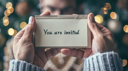 Woman holding a card with text You are Invited, close up