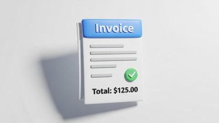 A 3D rendered invoice document with the word Invoice at the top, lines of text, a green check mark, and a total of $125.00.