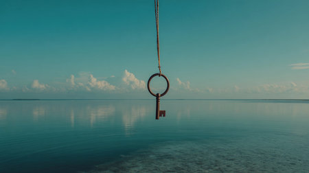 A vintage key is suspended above a still ocean, creating a unique scene in this calm setting with clear reflections.