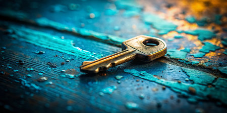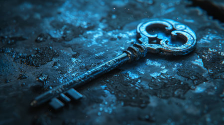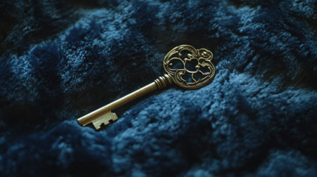 A single shiny metal key lies on a textured blue surface, showing its design and intricate details in the soft light, creating an artistic and captivating display.