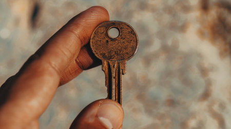 Close up image of rusty key held between fingers, showcasing its worn texture and unique shape. background is blurred, emphasizing key details and evoking sense of nostalgia