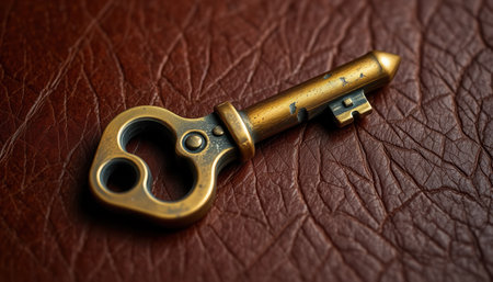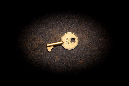 A close-up of a golden key resting on a dark surface, capturing intricate details and textures. Ideal for concepts of security and access.