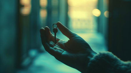 A close-up shot of a person's open palm holding a single, ornate, vintage-style skeleton key. The antique brass key is the central focus, symbolizing concepts like opportunity, solutions, security, secrets, or unlocking potential.