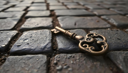 A single ornate key is featured, showcasing intricate design and signs of age on a plain, light surface