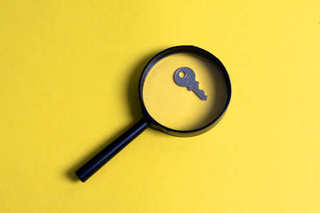 Magnifying glass with key on yellow background. Concept image of finding solution