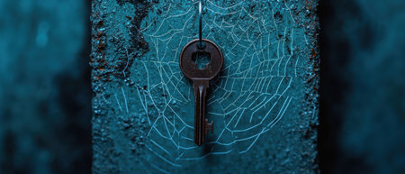 A vintage metal key rests elegantly on a soft blue background, embodying themes of security and access. The key