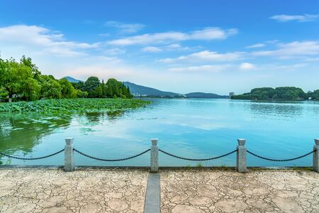 The empty waterfront of Hangzhoua West Lake, with no boats or tourists, just the serene natural beauty.