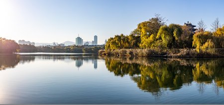 Autumn landscape with lake and city buildings in Beijing, China.