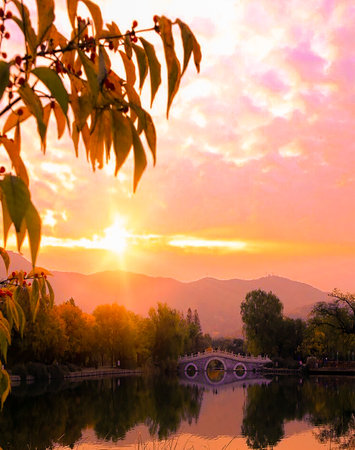 Beautiful view of Beihai Lake. Stunning fall landscape in Beihai Park. Asia, China, Beijing. Sunny day, clear blue sky. Warm autumn evening in Beijing. Concept of harmony and unity with nature. Relax