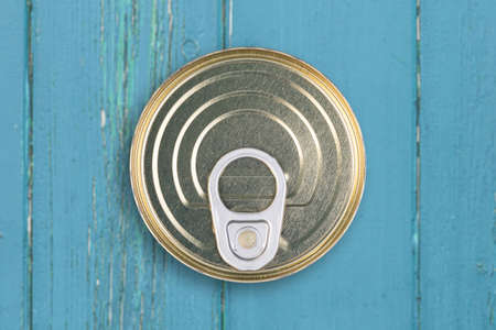 Canned food in a metal cylindrical container. Closed Tin can with ready-to-eat food. selective focus.