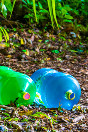 Big water barrels bottles in the jungle in Coba Municipality Tulum Quintana Roo Mexico.