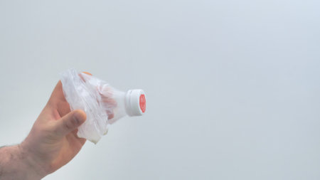 Male hand holding crushed plastic bottle over white background. Collection of plastic waste for recycling. Concept of plastic pollution and too much plastic waste. Copy the space at the top