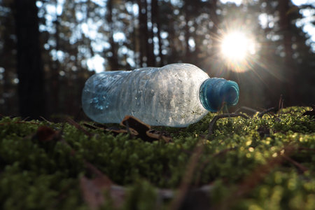 Used plastic bottle on grass in forest, closeup. recycling problem