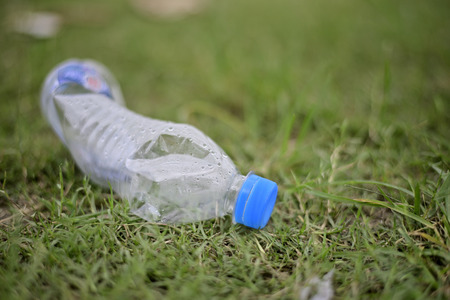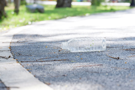 Littering plastic bottle with drinking water on the road at the green park for an environmental cleaning concept