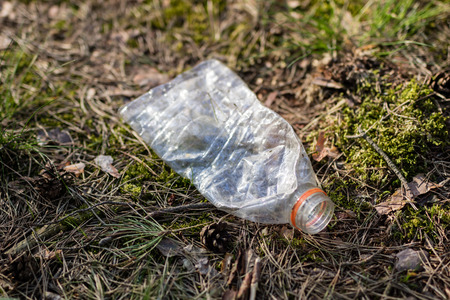Garbage left in the forest. Plastic bottles littering forest areas and parks. Season of the spring.