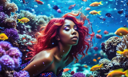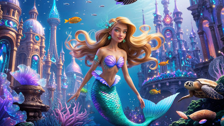 Mermaid exploring an enchanting underwater kingdom filled with colorful marine life and vibrant coral structures