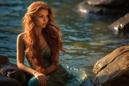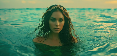 Beautiful mermaid swimming on the water. Attractive and sexy undine. Mysterious wet fairy siren. Legend of the ocean, top view