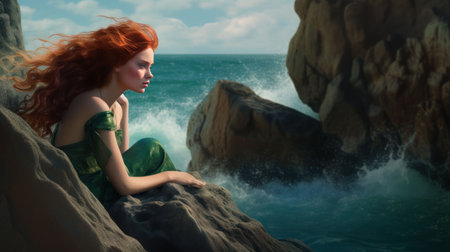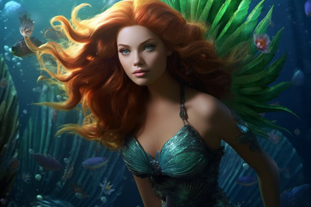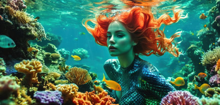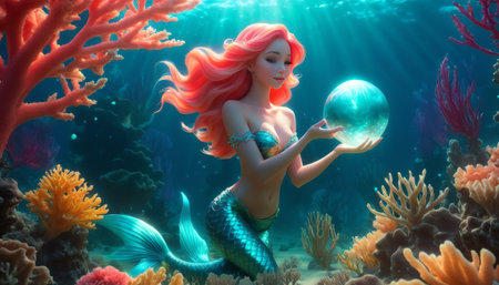 A stunning mermaid with vibrant red hair holds a glowing orb underwater. Surrounded by colorful corals and marine life, she radiates an ethereal beauty, creating a captivating fantasy scene.. AI Generation