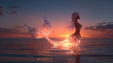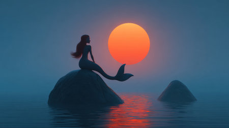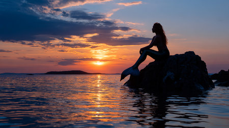A tranquil scene featuring a mermaid silhouette on a rock during sunset, casting a beautiful reflection on calm water, evoking a sense of fantasy and peace.