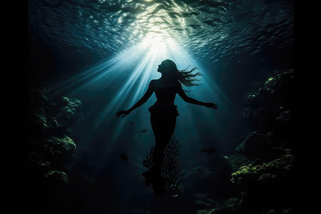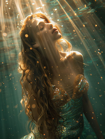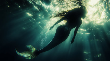 A mermaid swimming gracefully in clear, illuminated waters while beams of sunlight filter through the surface at midday
