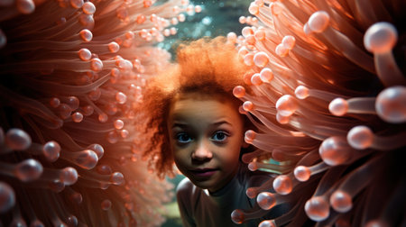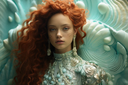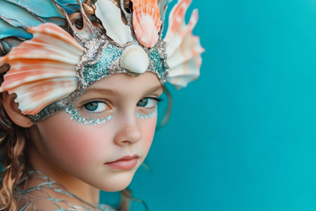 Portrait of a child with seashells and glitter makeup, embodying the enchanting allure of a mermaid against a vibrant teal backdrop