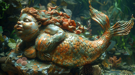 Mermaid statue in the aquarium. Decoration of the underwater world.