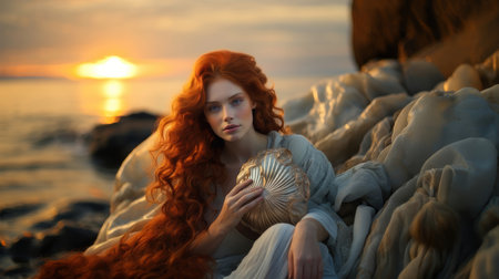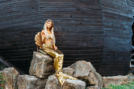 Fantasy woman real mermaid with trident myth goddess of sea with golden tail sitting in sunset on rocks.. Gold hair crown shells pearls jewelry. Mermaid sitting on shore. fantasy concept.