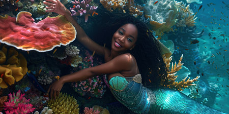 A serene mermaid rests among vibrant coral reefs as sunlight streams through the clear ocean waters Use for fantasy art and nautical themed designs.