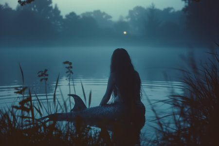 Beautiful mermaid in the lake in the morning. Fairy tale