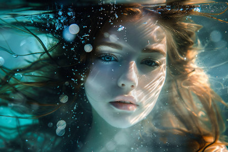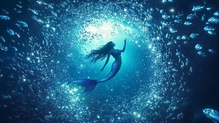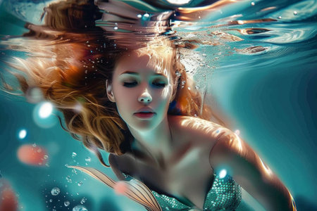 Beneath the shimmering surface, a mermaid with flowing hair glides effortlessly through the turquoise waters, surrounded by vibrant bubbles and magical light patterns, embodying the spirit of the sea.