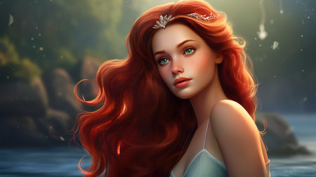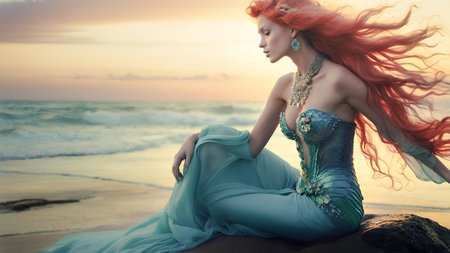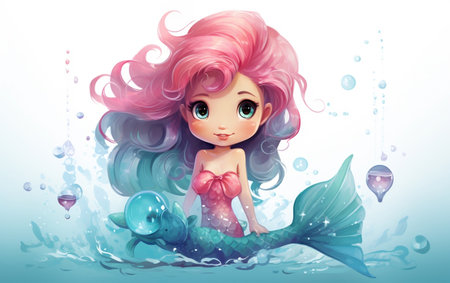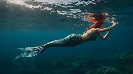 An AI-generated illustration of A beautiful mermaid glides gracefully through the crystal blue waters of the ocean