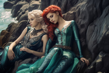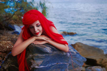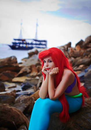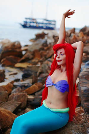 Young beautiful mermaid woman close up standing on the sea cost. Cosplay mermaid.