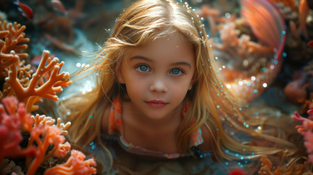 Young Mermaid Girl With Blue Eyes Gazing Up From Coral Reef