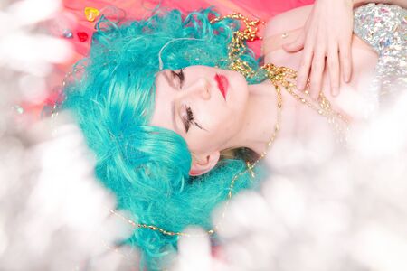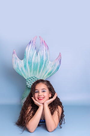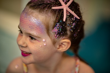 Portrait of a beautiful young mermaid girl at salon getting makeup on