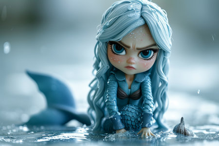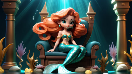 Whimsical mermaid princess on throne in underwater fantasy scene.