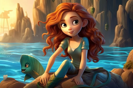 A Mermaid girl, with a fishtail and flowing hair, lounging on a rocky shore with the ocean waves crashing in the background, big eyes cartoon style illustration generative ai