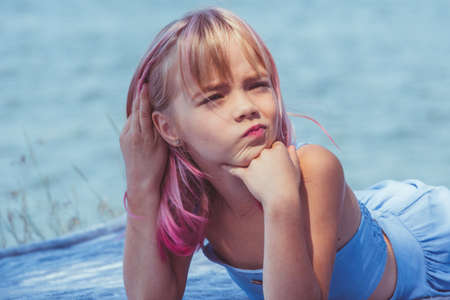 girl portrait. Outdoor portrait of cute little girl in summer day. girl with pink hair. Child 7-8