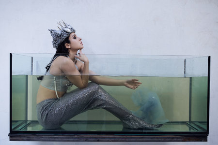 A young woman embodies a mermaid character, gracefully swimming with vibrant fish in an aquarium