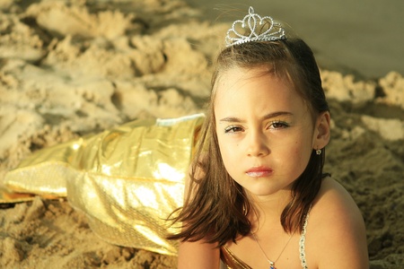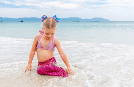Little beautiful girl dressed in swimsuit as a mermaid sits on the seashore