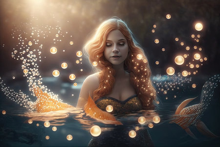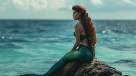 A mermaid sitting on a rock surrounded by fish. Generative AI image.